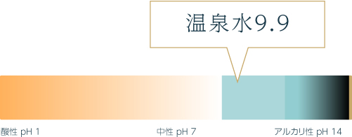 一般的な水がpH7前後の中性であるのに対し、温泉水99はpH9.5〜9.9のアルカリ性。