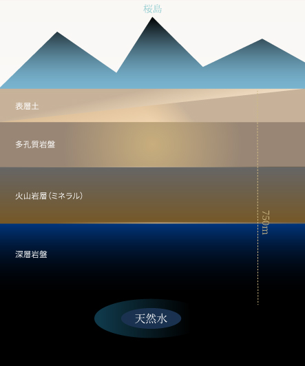 桜島火山帯の地層を通り抜けながら数万年の歳月をかけて地層に磨かれた天然水。